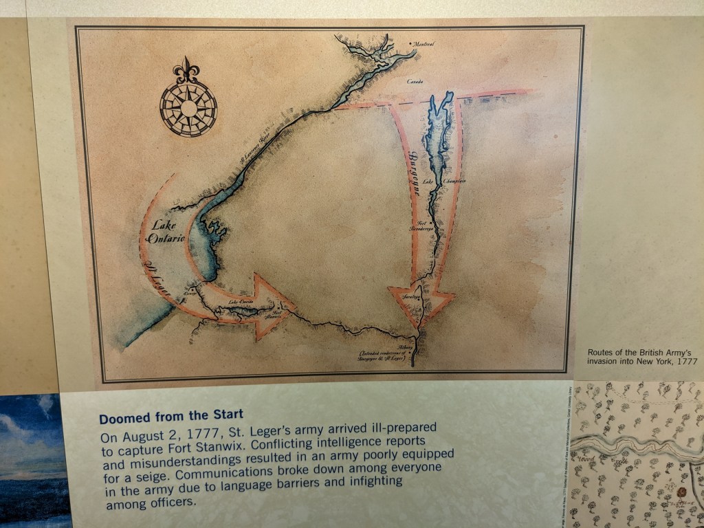 The fort is in the middle of the city of Rome, New York. It’s a bit of a jarring sight to see a preserved 18th Century wooden fort surrounded by a 21st Century urban area. Other than that, the facility looks great and is well-maintained. The visitor’s center does a good job of setting out the complex cultural, economic, political, geographic, and military factors that were at play in the Mohawk Valley during the period prior to the American Revolution and during the war itself. (That’s a nice fig leaf for people like me who go to these places under the guise of learning something, when we’re really just there to see cannons and cool Lincoln-Loggy structures.)