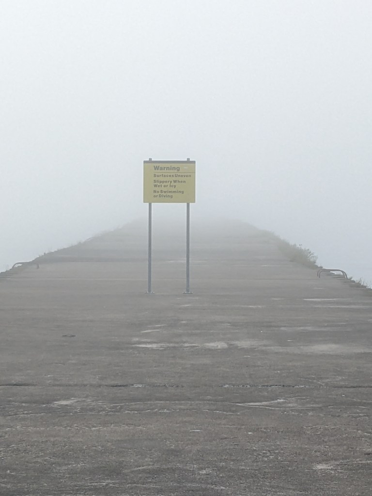 As we started walking around the park, we noticed that there was a heavy fog hanging over the lake. Skies up to the waterline were clear, but the pier was pea-soup territory. So much for the sunset stroll idea.