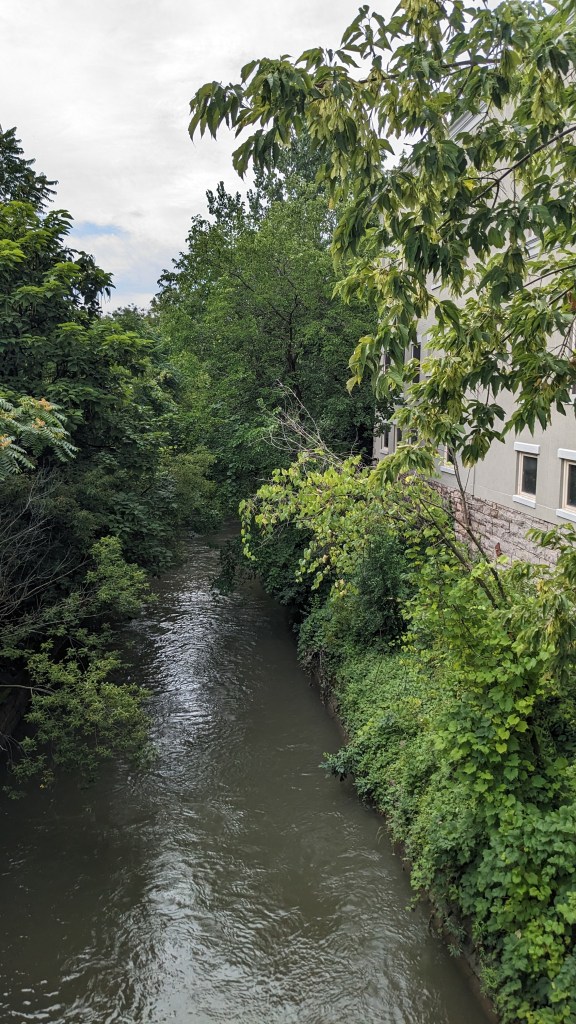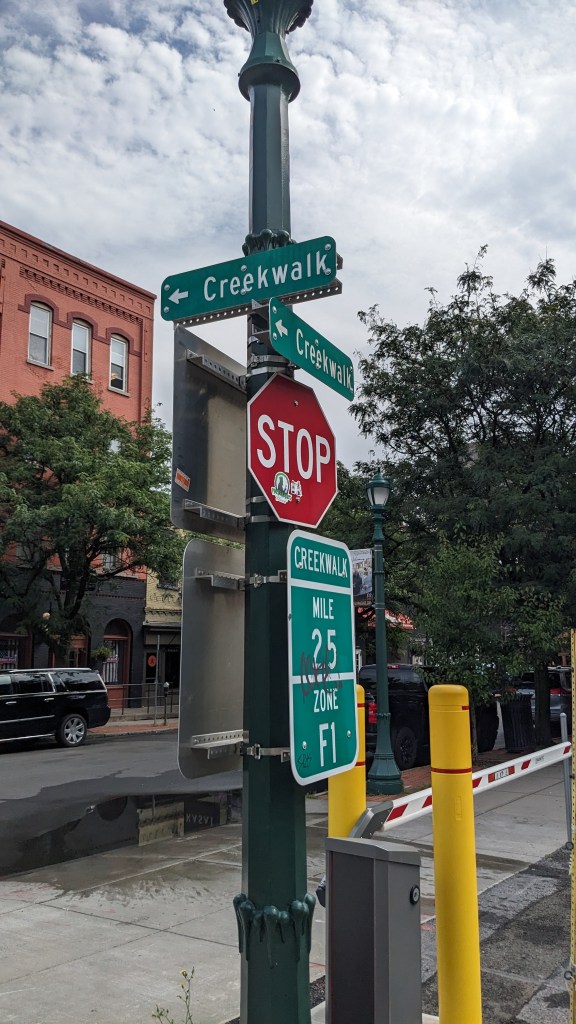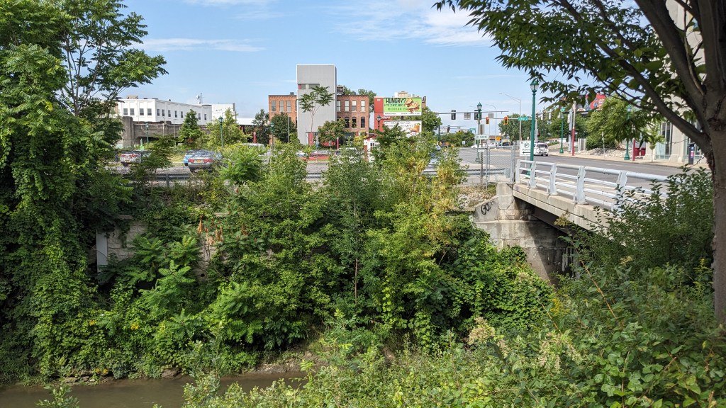 Onondaga Creek is a narrow little stream that runs mostly north-south and flows into Onondaga Lake. As waterfronts go, it’s pretty modest, but the city has tried to make the most of it. The creek is maintained as a linear greenspace through long stretches the city, and much of it can be viewed along the Onondaga Creekwalk.