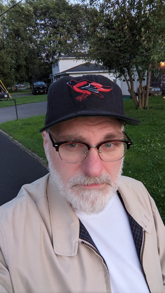 I have fond memories of this particular cap as I wore it defiantly a few times to games at Yankee Stadium and Fenway Park. During one visit to the Bronx around ’98 or ’99, the sight of this hat inspired a few dozen drunk bleacher-creature Yankee fans in the next section over to point at me menacingly and chant in unison, “Baltimore sucks! Go home!!” After a few choruses of that, I tipped my cap at them, and they got bored with me and turned their aggression to some other unlucky fan wearing an opposing team’s colors. Good times.