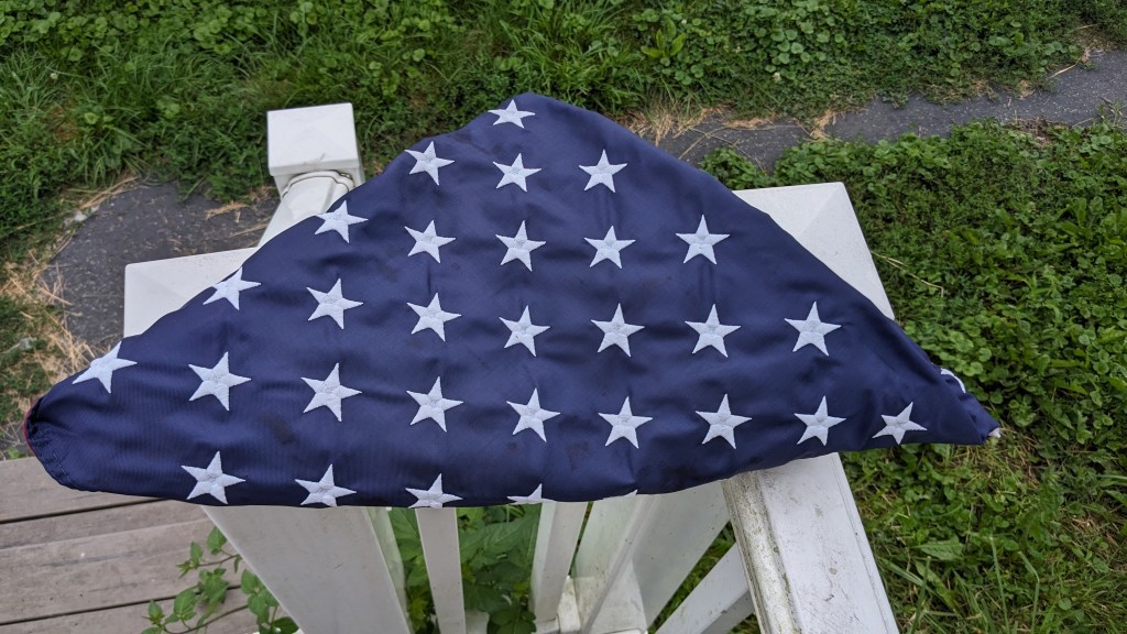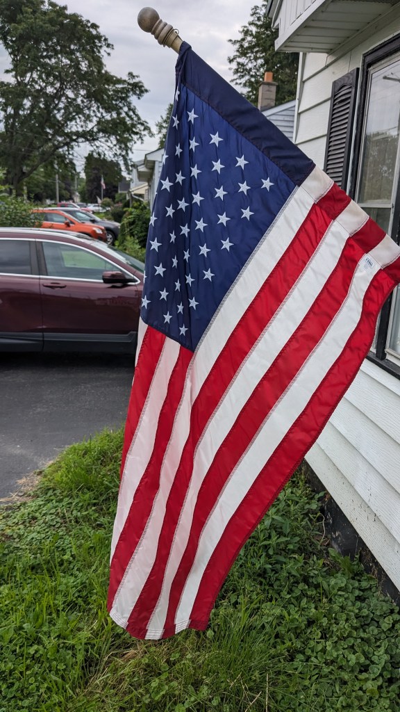 The Buffalo Bills’ first preseason game is today. That means it’s time for this household’s time-honored annual tradition (started last year) of the Switching of the Flags. Old Glory, which has been displayed on the house since Memorial Day weekend, comes down, and the Bills flag goes up. The latter won’t be taken down until after the Bills’ final game of the season, which I’m hoping will be on February 11, 2024.