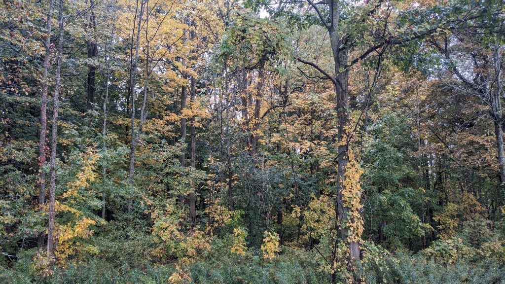 October began in Central New York with August-like weather. We enjoyed a few days of sunny skies and temps in the 80s.Despite the unseasonably warm start, it didn’t take long for gray skies and rain to take their usual place on the October menu.At this writing on October 7, the local fall-foliage season is just starting to get interesting. The next week or two will be quite scenic.Nothing says autumn like a musty old college lecture hall. This is the scene from a window in stately Sheldon Hall on the SUNY Oswego campus. Is there anything better than October baseball when your team is in the playoffs? Millie doesn’t think so.On par with October baseball is October football, especially when your team humiliates a comically over-hyped Dolphins squad by a score of 48-20. Trolling Miami fans on social media afterward is icing on the cake.‘Tis the season for front-lawn graveyard displays……and front-lawn electioneering.It’s hard to pass by a big pile of leaves like this and not want to jump into it. Somehow, Ursa resisted the temptation.