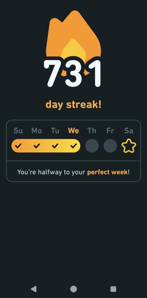 I’ll go back to using Duolingo at some point — maybe even soon — but I’m done with letting myself getting sucked into chasing gamification goals like streaks and achievement levels. Also, I’m never re-activating the harassing reminder notifications; they are truly the road to madness.