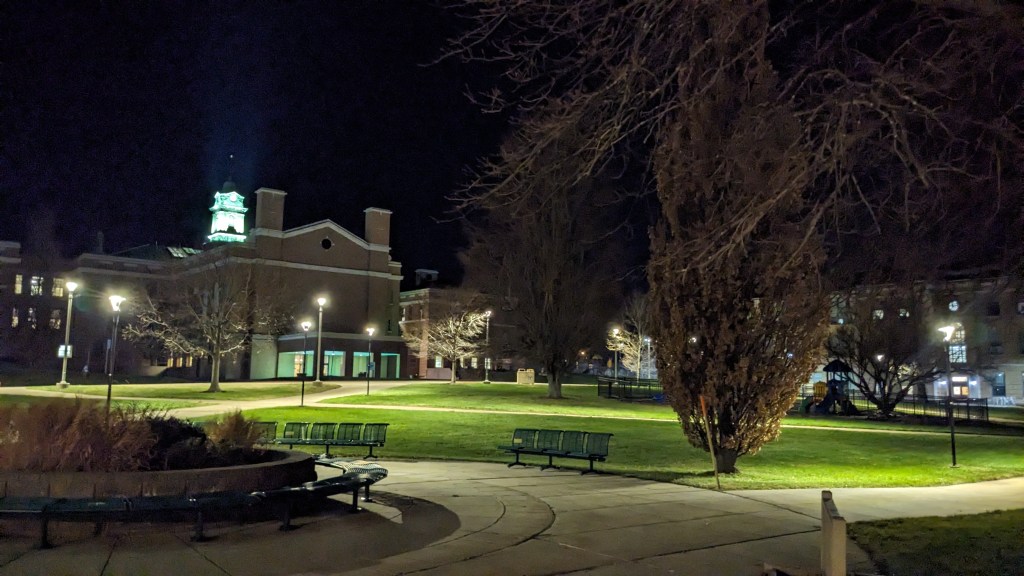 Looking back over my shoulder at campus one last time as I walked to the parking lot one last time in 2023.