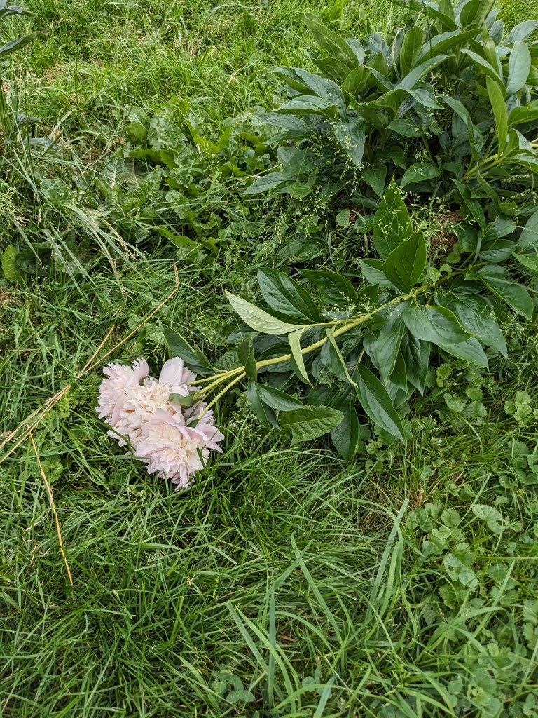 The second thing I know about peonies is that, when at full bloom, they are prone to flop over onto the ground — especially in wet or windy weather. At the very point when the peony reaches its finest hour, it gets too full of itself and collapses from the weight of its own overweening vanity.