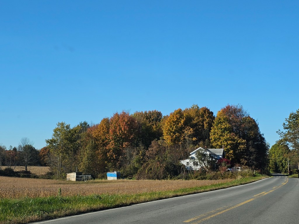 I suggested that we visit the cemetery in nearby Hannibal Center. That cemetery is tucked away on a dead-end road in the middle of farm country. I know the place well, as it has been the cemetery for much of my mother’s side of the family for over a century. My father is out there too. (It also contains a plot, bought and paid for decades ago, that’s waiting for me.) Based on my many visits to the cemetery over the years, I know that the adjacent woodland is always scenic in the fall. Besides, what better way to spend the run-up to Halloween than traipsing around a graveyard?