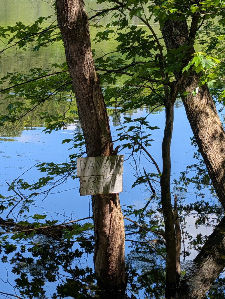 Glacier Lake is the centerpiece of the park. This basin is surrounded by steep limestone cliffs.Descending one of several flights of stairs down said steep limestone cliffs. This is one of the better sections of stairs, in that it actually has some handrails. Even without handrails, getting down to the bottom wasn’t too bad. Climbing back up was a bit more of an ordeal.Did I mention that the limestone cliffs were steep?Faust? I had some misgivings about heading down a trail with a name that evokes pacts with Satan, but we forged ahead anyway.The Faust Trail turned out to be lovely. While I was on it, nobody tried to bargain for my soul, which is always a relief. In my mind’s eye, the backdrop for pretty much every scene in James Fennimore Cooper’s Leatherstocking Tales looks exactly like this.I was game for the Mephistopheles trail, but I wasn’t about to wade through this one. If for no other reason, it reminded me too much of the 1981 film Southern Comfort.Underwater quicksand? Sounds terrifying. I was a little skeptical at first, but who am I to argue with a handwritten warning scrawled on cardboard?One of several geocaches hidden at the park. These army-surplus ammunition boxes contain a stamp to prove that you found it.A more subtle cache container.We let the youngest, most agile member of our party go after the cache that was hidden in a rough off-trail area.The day’s lunch. Jen is very proud of the new oh-so-twee picnic basket she bought for these excursions.A bonus of Clark Reservation is that it’s right down the road from a Gannon’s — a Syracuse institution that many consider to be the best ice cream stand in Central New York. All the calories I burned on the hike were quickly restored by a pineapple milkshake.