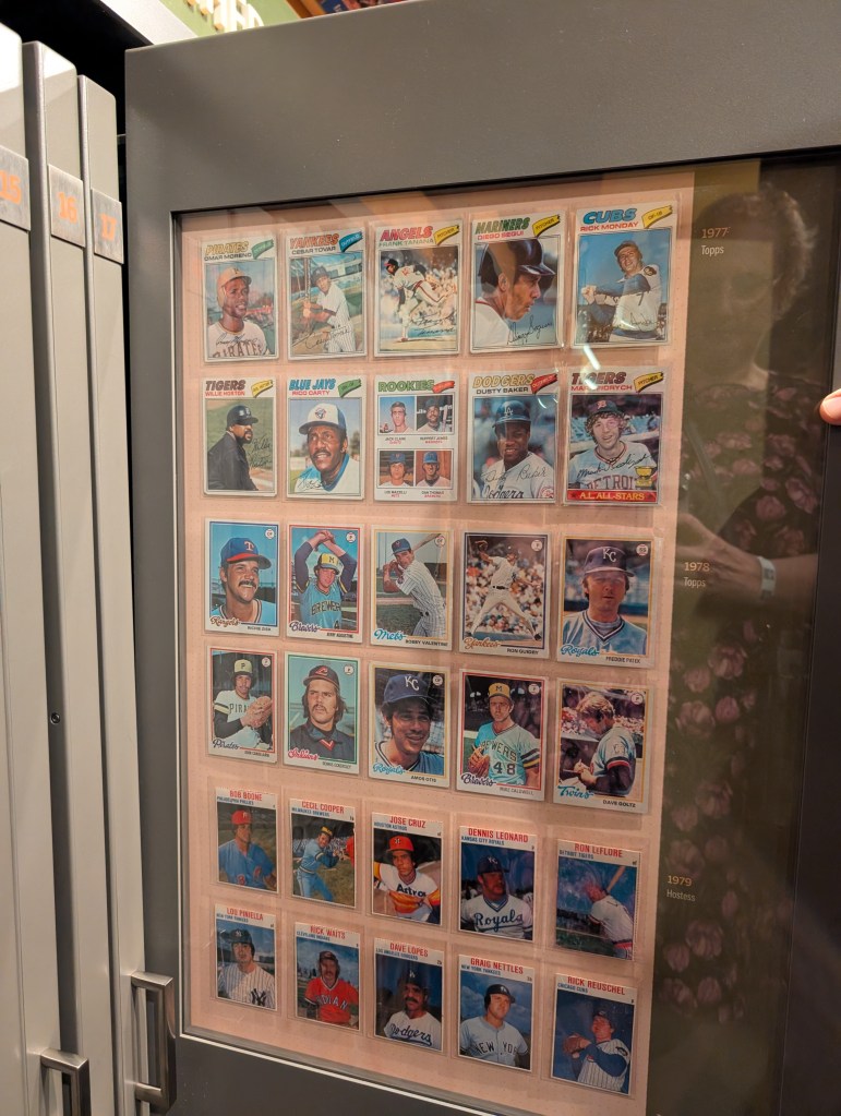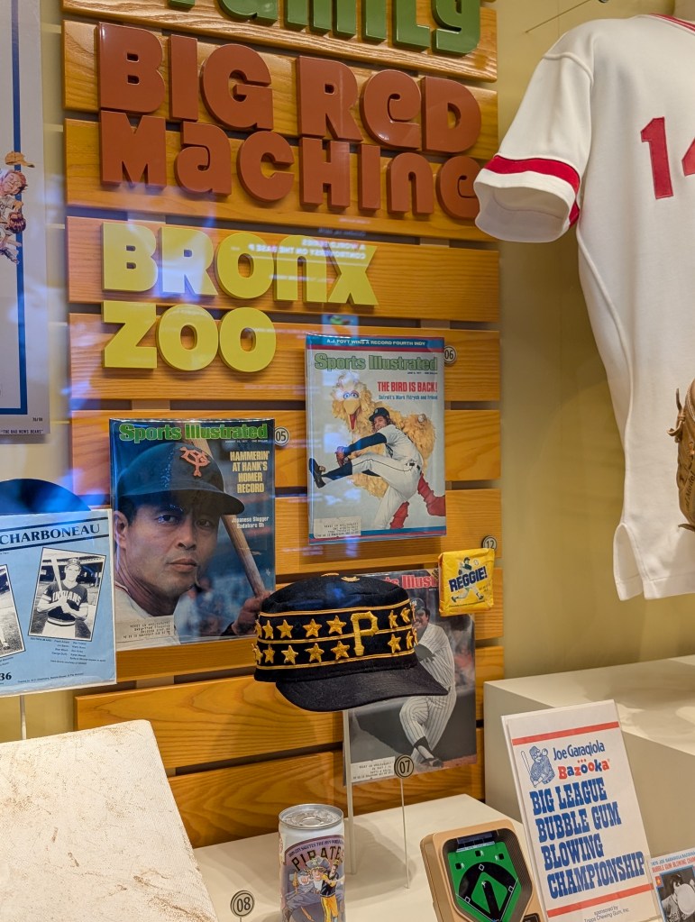 Not surprisingly, Babe Ruth’s image is ubiquitous inside the Hall of Fame and Museum. This promotional poster for a Far East tour presents a different look for the Babe.“The tools of ignorance.”Before there was Babe Ruth, Christy Matthewson was the undisputed king of New York baseball. The museum has devoted a generous amount of exhibit space to the Negro Leagues — a portion of baseball’s story that was under-told for a long time.It was nice to see Hank Aaron get a big exhibit. He was and still is criminally underappreciated as one of the greatest players of all time.Was there anything more fun than baseball in the 1970s? I’m biased because that is the era in which I became a fan, but still. Also, the Reggie! candy bar was damn tasty.Speaking of baseball in the 1970s…I quite enjoyed this collection of baseball personalities and notable moments interpreted as tongue-in-cheek comic book covers. The Dave Parker cover, in particular, had me laughing out loud.A Leroy Neiman piece; because if it had anything to do with sports, Leroy Neiman did a painting of it.This shelf of bobbleheads is just the tip of the iceberg of a much larger bobblehead exhibit. A nice touch was that the shelves vibrate to ensure continuous bobbling of the heads.Along with bobbleheads, there was a very substantial exhibit devoted to baseball cards and their fluctuating monetary value and place in the culture over the years. According to this, the sports market crashed after 1991. Thanks, Clinton.Trying my hand at some baseball trivia.Several generations of fans will remember Phil Rizzuto for his trademark “Holy Cow!” catchphrase. (I prefer to remember him for those low-budget TV spots he used to do for The Money Store, but that’s just me.)The entrance to the Hall of Fame Gallery, a.k.a. the part of the building everyone has come to see.The late great Rickey Henderson. Rickey never played for my team and, in fact, spent much of his career playing for teams that I actively rooted against, but I grudgingly became a fan of him as an individual player. In his prime, he was a fearsome offensive weapon. Throughout his career, he was one of the true characters of the game, in the very best sense. He left us too soon.