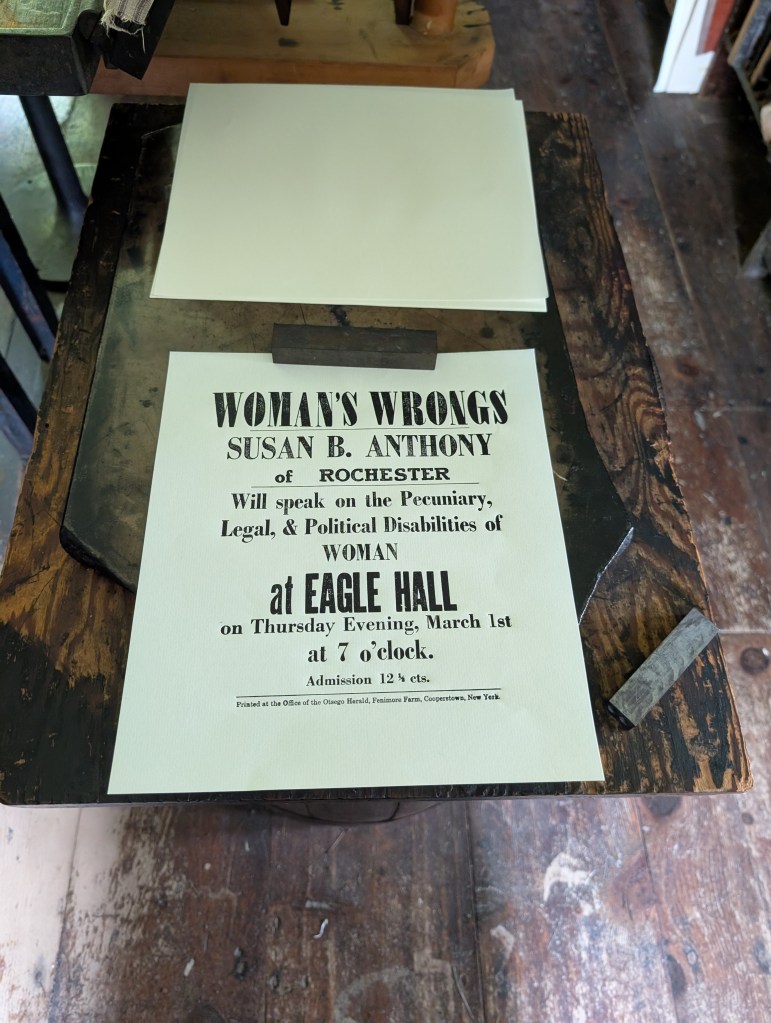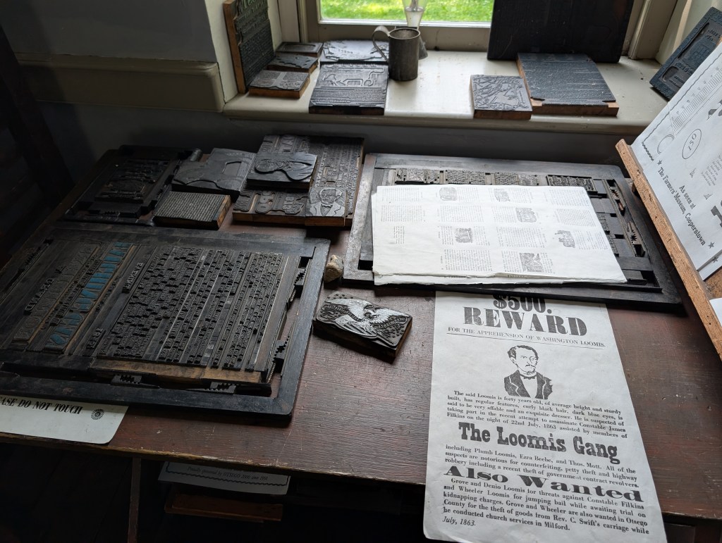I had a chance to see a 19th century-style print shop in operation at the Fenimore Farm & County Village in Cooperstown. The Fenimore Farm attraction is essentially a living history museum depicting life in rural upstate New York during the early 1800s. (Kind of an Empire State version of Old Sturbridge Village.) The print shop operates under the name Otsego Herald, which was apparently a Cooperstown newspaper of that era.